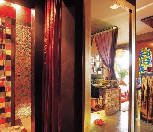 随意间的色彩斑斓与深色基调形成对比,起居空间的气氛整个活跃了起来。暗红和金黄交替出现在墙面,还有一些陈设品,带来一丝含蓄的炽烈。