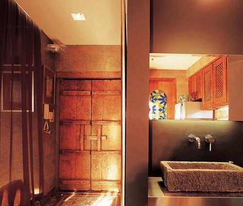 一个极具年代色彩的木门,一幅充满异域风情的装饰画,一个粗犷却不失风格的洗面台,将泰式风格贴近自然的守则阐释得淋漓尽致。