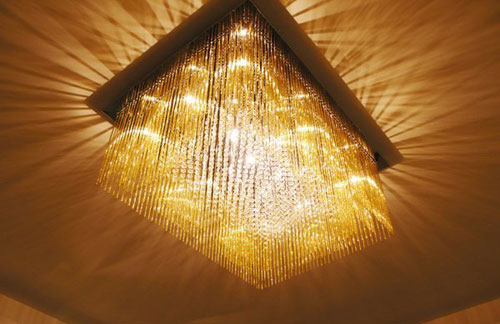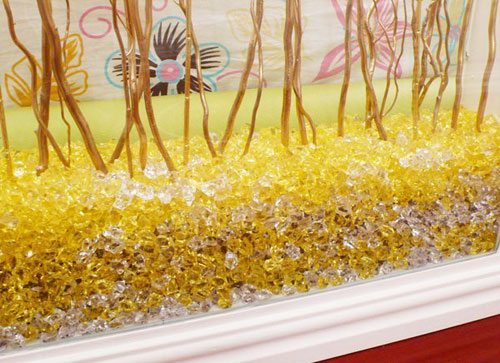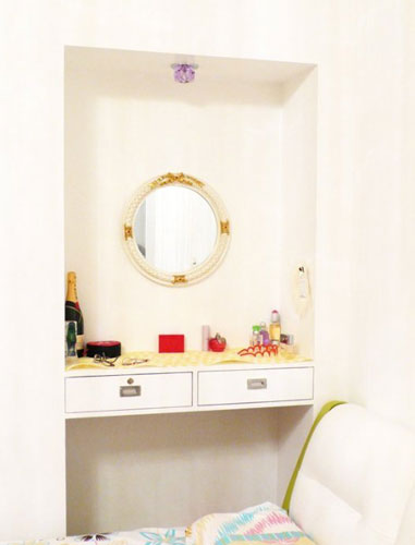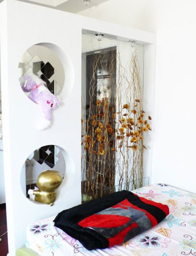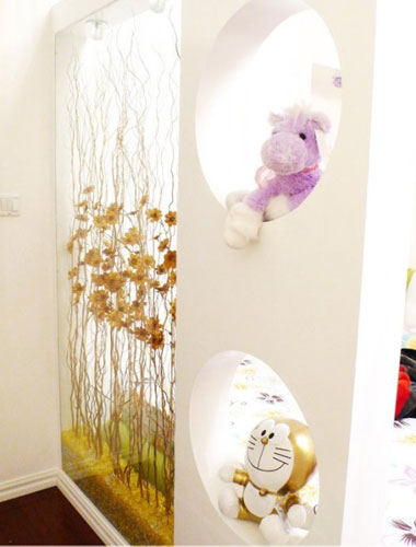 镜子的对面就是这个背景墙了,当时在装修的时候就考虑怎么做,因为后面放着床,如果开门马上可以看到,所以做了这个,为了让他显的通透,我还在旁边挖了2个洞,可以放些装饰品。我在两面都装了玻璃,里面决定插花,这些花可是我一根根插上去的,很辛苦啊。下面部分我买了插花棉固定花,最要说的就是里面的水晶珠了,我分了两种颜色白色和黄色的,才3分钱一粒,我一共买了4000个。花费才220元,但是效果真的很好。