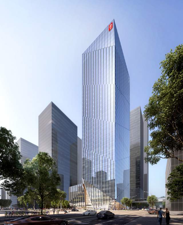 该建筑由美国GP设计,方案巧妙融合现代建筑美学与岭南传统建筑智慧,以简约现代的外观设计为基底,通过建筑底部、楼冠及立面的折面造型设计,勾勒出灵动的水晶视觉效果。