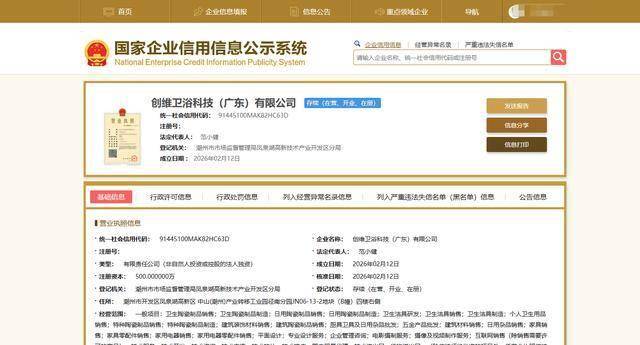 天眼查显示,创维卫浴成立于2026年2月12日,注册资本500万元,法定代表人为范小健,经营范围含卫生陶瓷制品销售;卫生陶瓷制品制造;日用陶瓷制品销售等。该公司由创维集团有限公司100%持股。