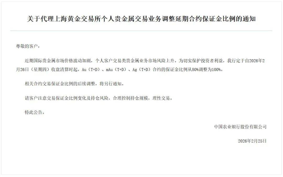 2月25日, 农业银行发布《关于代理上海黄金交易所个人贵金属交易业务调整延期合约保证金比例的通知》。通知称,近期国际贵金属市场价格波动加剧,个人客户交易类贵金属业务市场风险上升。为切实保护投资者利益,自2026年2月26日收盘清算时起,Au(T+D)、mAu(T+D)、Ag(T+D)合约的保证金比例从80%调整为100%。