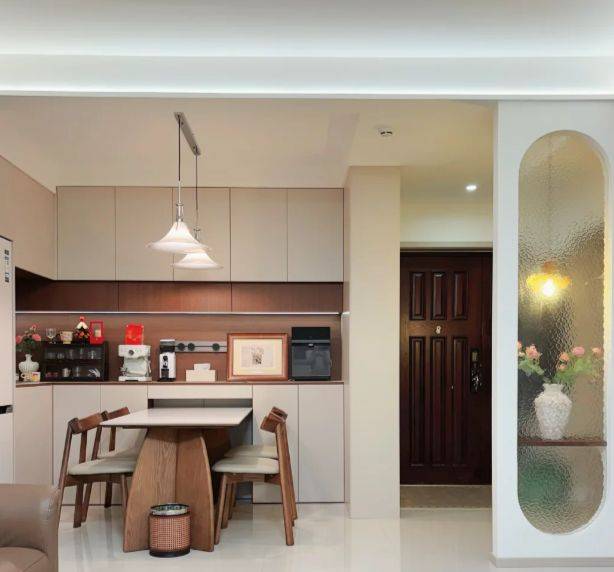 墙角的收纳也要透气。别再堆那些落灰的装饰瓶了。一组高低错落的藤编筐,既能收纳杂物,又带着自然的肌理;墙上装两块窄窄的橡木隔板,放上几本家常菜谱和一束干枝梅,视线有了落点,空间却不显堵。但这里要提醒你,千万别为了装饰而挂上一幅巨大的复杂图案挂画,那会让小餐厅像穿了件不合身的印花袍子,眼花缭乱,反而更显局促。简单一面圆镜,映出窗外的天光和家人的笑脸,才是最好的扩容术。当新年的烟花在窗外亮起,一家人终于齐齐整整地围坐在桌前,杯盘虽略挤,笑语却满堂。你会发现,家的尺度,从不在于面积,而在于它能否妥帖地容纳每一份团圆的渴望。