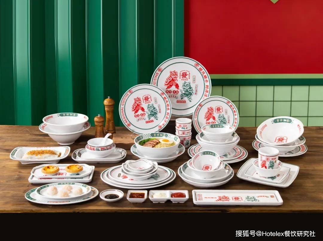b.“狮潮聚宝” 密胺餐具系列,以国潮醒狮与 “發” 字为核心视觉,红绿撞色复刻港式茶餐厅的复古烟火气。系列涵盖面碗、点心盘、长方盘、味碟等全品类,从广式早茶到快餐简餐都能适配。