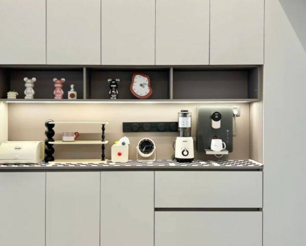 若是将柜体全部装上封闭的柜门,空间则瞬间安静下来。米灰色的哑光烤漆面板,把手也省略了,轻轻一按,柜门便弹开,露出里面码放整齐的囤货——那些节日才用的浮雕餐盘、朋友送的异形咖啡杯,都被妥善安放。墙面一片素净,你摆上一盏暖黄色的纸灯,灯下是每天的早餐角落。烤得微焦的吐司放在温润的陶盘里,咖啡的热气袅袅升起,背景是干干净净的柜门,不争不抢,只衬托着眼前食物的美好。