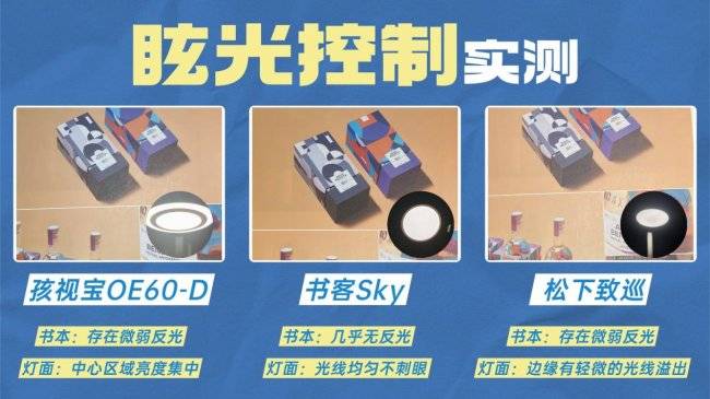 · 孩视宝OE60-D:同样采用侧发光,并设计了面环双光源结构,能在一定程度上让光线更均匀扩散。但在实际最高亮度测试中,灯面中心区域存在轻微的亮度集中,光滑书面上也有微弱反光,虽然不影响正常阅读,但也不够完美。