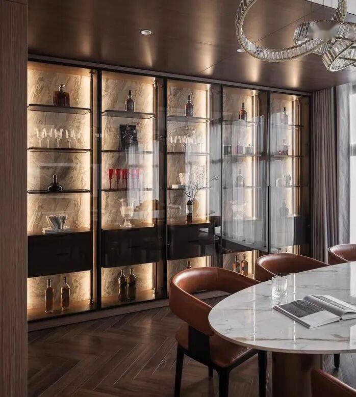 封闭式收纳则兼顾整洁与美观,木质柜门与玻璃门的组合,既能隐藏杂物,又能展示精致的酒具与藏品。