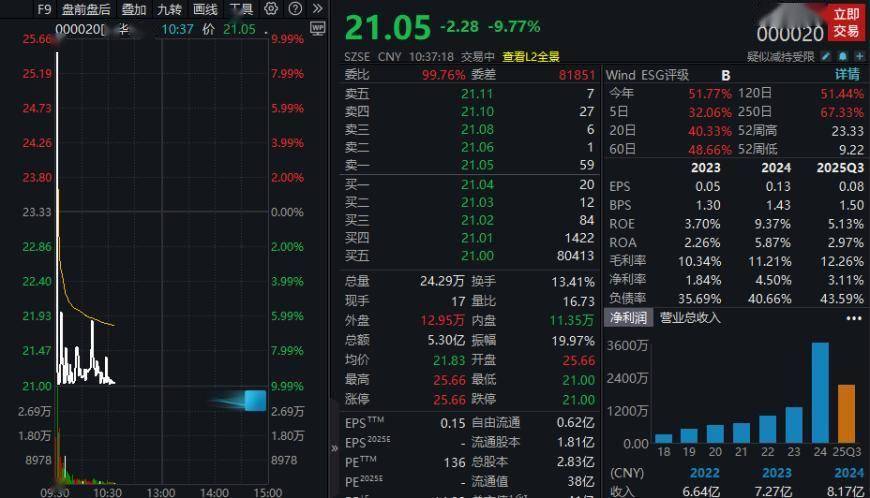 早间,该股以涨停价开盘,但不足3分钟便上演“高台跳水”,盘中几度触及跌停,上演“天地板”走势。截至发稿时,其股价仍围绕跌停价反复震荡。