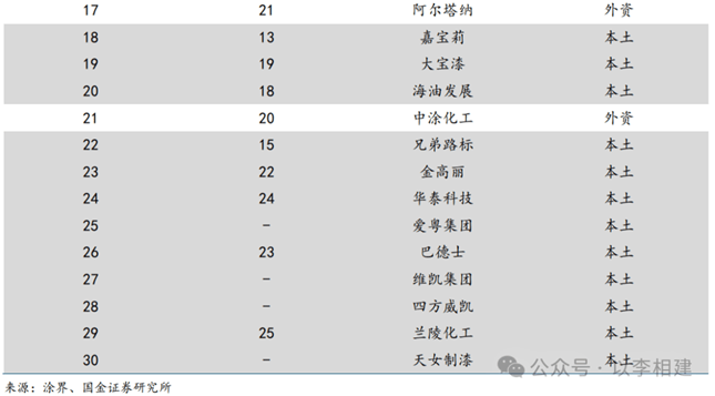 根据涂界,2024年中国工业涂料市场规模3024亿元,同比+5%,呈现“整体分散、但细分领域集中度高”的格局;外资仍占优势,国内前七强均为外资品牌,但民族品牌在风电、集装箱等领域已突破外资品牌的长期封锁,新一轮的国产替代浪潮正在酝酿。
