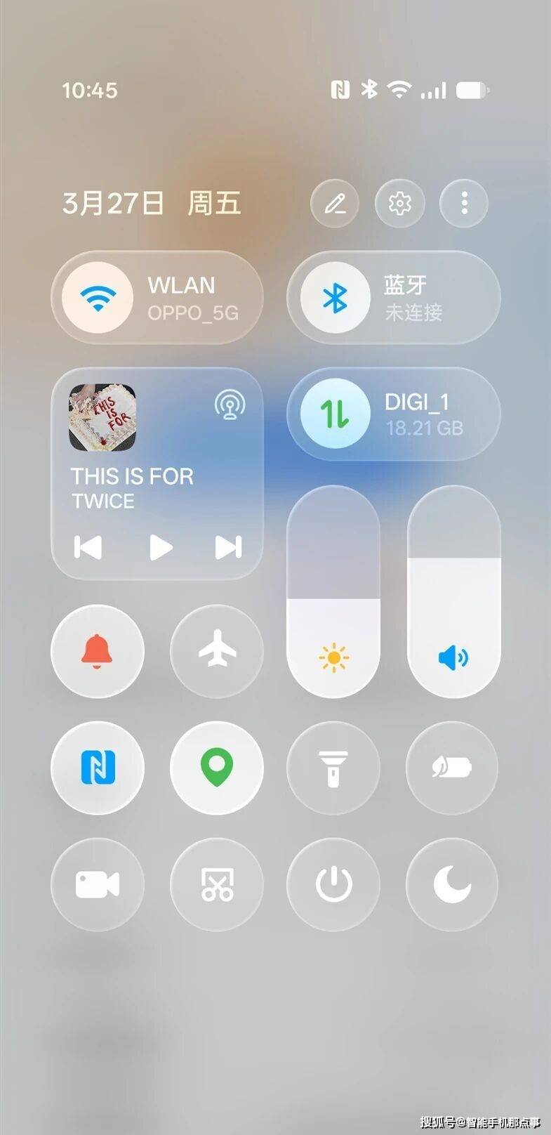 而且模块化的布局很懂用户,WLAN、蓝牙的大尺寸卡片一目了然;音乐控件、流量信息做成了可灵活排布的独立模块;亮度和音量的长条胶囊控件直观又好操作;下方的快捷开关排列整齐,图标简约清晰。
